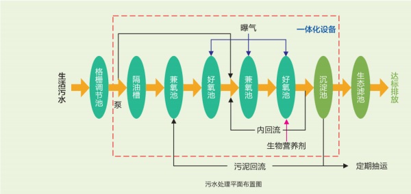 本項目為武鋼資源集團(tuán)程潮礦業(yè)有限公司選礦分公司生活污水處理工程。該污水處理站平常服務(wù)人口為140~160人,高峰期服務(wù)人口為200人左右,設(shè)計污水處理量為30m3/d。根據(jù)現(xiàn)有的技術(shù)特點及我司先進(jìn)的污水處理專利技術(shù)工藝,本項目采用國內(nèi)專業(yè)的生化處理技術(shù),即多級AO脫氮除磷工藝,使用一體化設(shè)備對辦公樓生活污水集中處理,保證出水水質(zhì)達(dá)到國家規(guī)定的《城鎮(zhèn)污水處理廠污染物排放標(biāo)準(zhǔn)》(GB18918-2002)一級A排放標(biāo)準(zhǔn),終水回用至選礦場作為綠化用水。